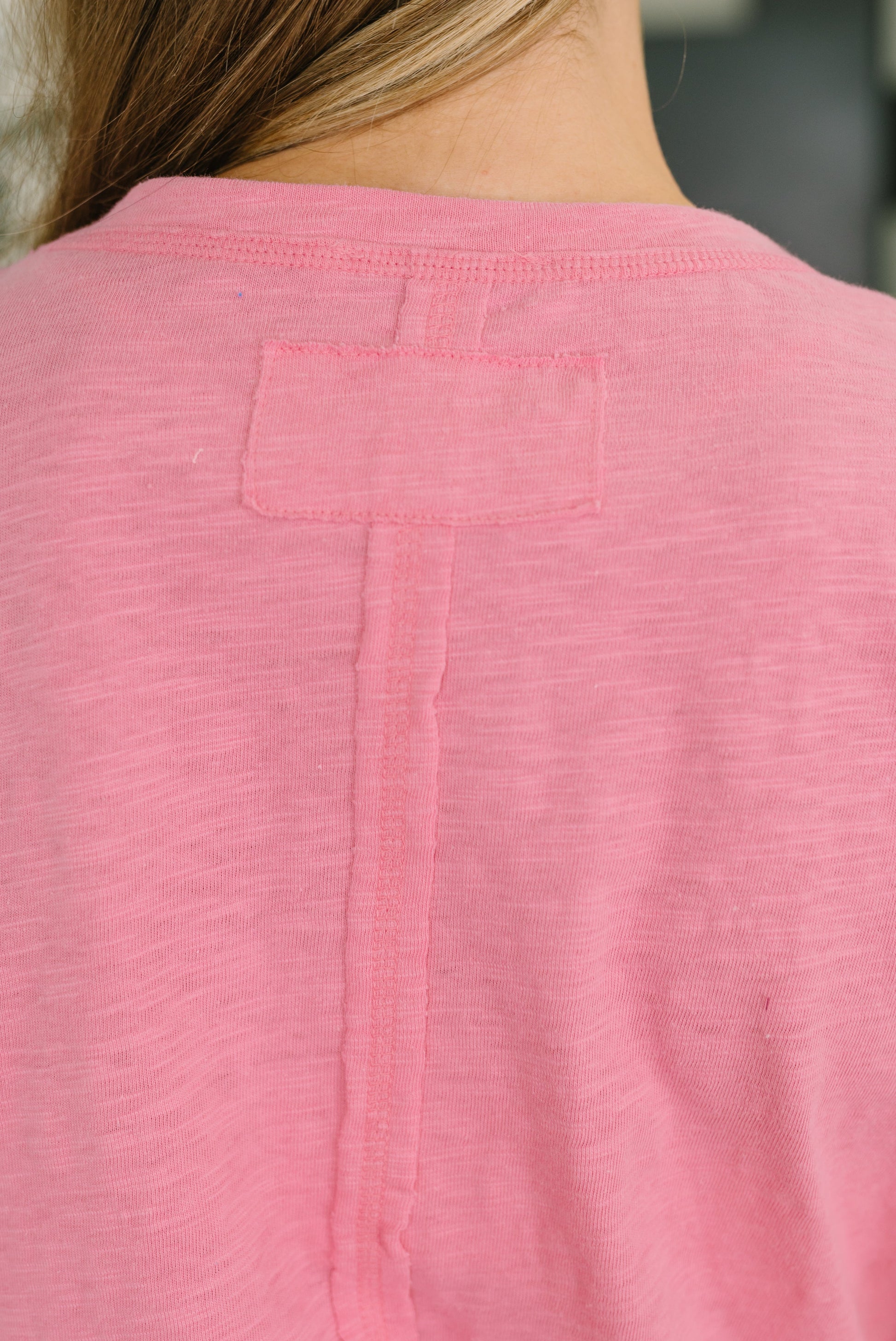 The Effortless Edit Boxy Tee in Candy Pink features a relaxed, contemporary silhouette crafted from soft jersey knit with gentle stretch for all-day comfort. The heathered fabric adds subtle texture and depth, while the banded round neckline and drop shoulder design create an effortlessly chic look. Side slits and an exposed center seam at the back provide modern edge, complemented by exposed seam details throughout and a faux back outside tag for authentic styling.